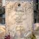 Set a tone of grand elegance for your estate wedding with this design featuring a faux bas-relief Baroque arch, musical angels, and a romantic blue palette.This design features a highly detailed, printed simulation of classical architectural carving. A central archway, rendered in the style of 3D white plaster, frames the text details against a faux dusty blue background. The artwork includes intricate bas-relief effects of blooming white roses, acanthus scrollwork, and two swans at the base. At the top of the column, a cherub angel playing a violin adds a touch of movement. The typography blends an ornate calligraphy script with a traditional serif font in dark charcoal grey for readability.This is a flat printed image with a faux stone texture effect, not actual raised material or embossed paper.