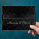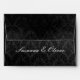 This envelope features sumptuous grey and silver damask on the inside lining. The outside is a luxurious, textured black design. The design is lightly distressed for a charmingly vintage look throughout. A couple's name is written in white script below the back flap.