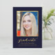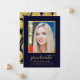 Announce your graduation with this classy photo graduation announcement featuring the word "Graduate" in a stylish script in faux gold foil against a dark blue background with a faux gold foil border around the photograph. Card has a faux gold foil circles pattern against a dark blue background back side.