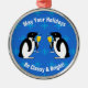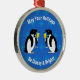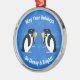 Keeping things classy for the holiday season are these adorable penguins, dressed in their tuxedos, and toasting the holidays. The ornament background design is dark blue with a light blue repeating snowflake pattern. The white text reads "May Your Holidays Be Classy & Bright!". You can remove the text or personalise the ornament with your own text.