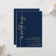 Classy Calligraphy QR Code Navy Gold Wedding. Add your QR code to your wedding website on the back makes this a convenient option for your guests to RSVP and see all the details without the need for separate RSVP and details cards. Stylish set script is rotated to the left hand side, with all the details stylishly to the right with lots of white space for a contemporary feel. Easily personalise with your details. And change the colour of text and background if you wish via the edit further option.