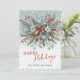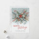 This holiday greeting card is distinguished by its elegant and unique design. It features a classic "Happy Holidays" greeting, which you can customize to your preference, set against a beautiful dark teal blue, white, and maroon red wreath bouquet pattern. The front of the card includes space for your family name and a seasonal message, while the back provides an ideal area for adding a custom message or poem. It's a stylish way to send your holiday wishes.