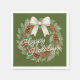 This beautifully designed holiday paper napkins showcases elegant watercolor artwork of a wreath embellished with a white bow, pinecones, green holly leaves, red berries, and pine needles. Its classy yet rustic design captures the essence of the December holiday season and appeals to those who appreciate artistic illustrations. The napkin offers customisation options, allowing you to personalise it with your seasonal greeting, making it a thoughtful choice for spreading holiday cheer.