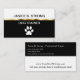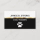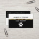 Classy dog training business cards with beautiful black and white background colour, two side text layout you can customise and personalise, and a lot of style that includes a dog paw print silhouette design element. Designed for a dog trainer, obedience school, or pet training.