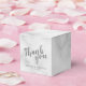 featuring word 'Thank you' in grey modern script font with name and date in modern sans serif font on white marble background.