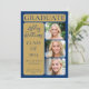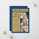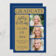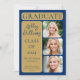 Classy and elegant minimalist-style dark blue and gold-tone three photo graduation announcement design. All colours and text are editable.