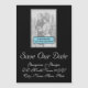 The front of this classy and glamourous save-the-date magnetic card design features the message "SAVE our DATE!", along with custom names, a date, and event details. It also features an area with a photo that can be personalised. Magnetic cards like this might be used to let potential guests know about an upcoming wedding celebration or some other event.