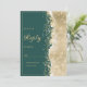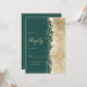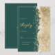 Classy luxury gold sparkle glitter wedding RSVP invitation. Set against a deep green background,