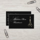 Classy and elegant monogram business cards for a professional Hairdresser designed with silver metallic looking hair cutting shears with calligraphy style name and monogram name initials you can replace on the front and your contact details beautifully shown on the back in modern typography style.