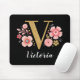 A beautiful, feminine monogrammed pink floral mouse pad, featuring pink flowers and a faux gold monogram letter V. Personalise the mouse pad by adding your name underneath the monogram. Makes a fun gift for a friend or for a bridesmaid gift. Designed for you by Blackberry Boulevard.