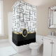 Classy and elegant monogram bathroom shower curtain in a modern geometric design you can personalise with your own family or name initial. Designed in gold, black, and white with an abstract pattern that adds a touch of class.
