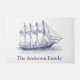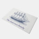 Nautical themed family name doormat with a detailed navy blue schooner illustration over white.