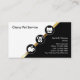 Here's the classy pets in business card template with gold coloured geometric lines and black and white pet symbols including a dog comma a cat, and a rabbit. Designed for a pet shop, doctor of veterinary medicine, or pet supply shop.