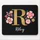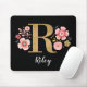 A beautiful, feminine monogrammed pink floral mouse pad, featuring pink flowers and a faux gold monogram letter R on a black background. Personalise the mouse pad by adding your name underneath the monogram. Makes a fun gift for a friend or for a bridesmaid gift. Designed for you by Blackberry Boulevard.