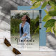 Classy script text "Graduate" two photo graduation announcement design featuring a large 5" x 7" photo on front with a smaller square photo on the back top and your graduation details below. The front template is set up for your graduating senior's name, class year and school on bottom underneath the script "Graduate". A white semi-opaque background overlays the photo to make the black text at the bottom pop. Available with assorted background colours or the design can be edited to change the back background colour and text colours as desired. "Graduate" text style can only be edited by designer, but the colour is editable. Composite design by Holiday Hearts Designs (rights reserved) with template placeholder photos provided via Unsplash.
