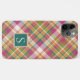 Contemporary pink red, green, orange, and white tartan plaid pattern. With room to customise or personalise with a monogram or initial of your choice. Beautiful, modern, and cool cover for the trend-savvy and art-loving hip trendsetter, artsy motif lover who wants to protect their phone from dust and dirt, wear and tear. This design is available in Apple iPhone 6, 7 and 8 Plus, 10 or X, XR, XS, 11, 12, 13 Mini, 14, 15 Plus, and Pro Max cellphone cases. Show off your style, look fashionable trendy, and feel stylish with a unique design on a mobile device accessory of your choice.