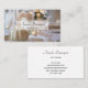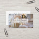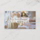Business cards with a beautiful classy photograph. A Thanksgiving holiday table featuring fine china and glassware. Fancy golden bokeh lights in the background. A single off white gourd sits on top a plate.