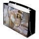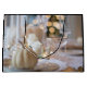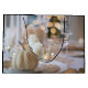 Gift bag with a beautiful classy photograph. A dinner table featuring fine china and glassware. Fancy golden bokeh lights in the background. A single off white gourd sits on top a plate.