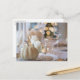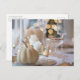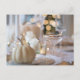 Postcard with a beautiful classy photograph. A Thanksgiving holiday table featuring fine china and glassware. Fancy golden bokeh lights in the background. A single off white gourd sits on top a plate.