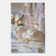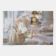 A kitchen towel with a beautiful classy photograph. A Thanksgiving holiday table featuring fine china and glassware. Fancy golden bokeh lights in the background. A single off white gourd sits on top a plate.