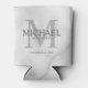 This can cooler features personalised groomsman's name with title and wedding date in grey and monogram in light grey as background, in classic serif font style, on white marble background.