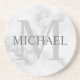 features personalised name in grey and monogram in light grey as background, in classic serif font style,