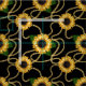 Fabric with an elegant and stylish pattern. Pretty yellow sunflowers and green leaves surrounded by delicate gold chains. Black background.