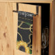Kitchen towel with an elegant and stylish pattern. Pretty yellow sunflowers and green leaves surrounded by delicate gold chains. Black background. A black frame with a faux gold foil border with your name inside.