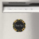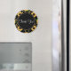 Thank you magnet with an elegant and stylish pattern. Pretty yellow sunflowers and green leaves surrounded by delicate gold chains. Black background. A black circle with a faux gold border layered over top with your text inside.