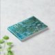 Wedding guest book featuring monogram names and date in gold foil with Claude Monet Water Lilies painting background.