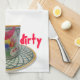 A fun kitchen towel showing clean or dirty china cups. The dirty coffee cup has a red lipstick stain.