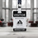 Vertical visitor badge with a simple design in black and white. VISITOR is written in bold white letters against a black background to be easily visible. Add your business name, logo, and branch. At the bottom, the badge number.