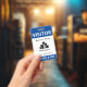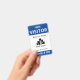 Vertical visitor badge with a simple design in blue and white. VISITOR is written in bold white letters against a blue background to be easily visible. Add your business name, logo, and branch. At the bottom, the badge number.