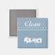 This pretty magnet features a blue background. The top has a pretty geometric design on the background and says clean. On the bottom it's a solid blue background and says dirty. Use on your dishwasher to let everyone know if the dishes are clean or dirty.