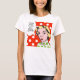 This fun t-shirt design features a pop art drawing of a woman wearing green and white polka dots with a speech bubble that says, "A clean house is a sign of a broken computer." Her raised eyebrows, perfectly coifed hair and ruby red lips give her an authoritative air. The woman and thought bubble are on a red and white polka dot background.