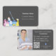 A grey background decorated with cleaning equipment. Personalise and add Your photo, name, text contact info and your own QR code to your website address. White text.