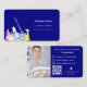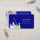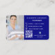A navy blue background decorated with cleaning equipment. Personalise and add Your photo, name, text contact info and your own QR code to your website address. White text.