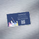 An elegant and glamourous business card on a navy blue background decorated with cleaning equipment. Personalise and add Your name, text, contact info and your own url to your website or your social media account to the QR code.