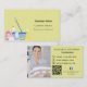 A light yellow background decorated with cleaning equipment. Personalise and add Your photo, name, text contact info and your own QR code to your website address. Black text.