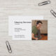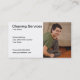 professional business card design with a smiling young man with vacuum cleaner doing the housework