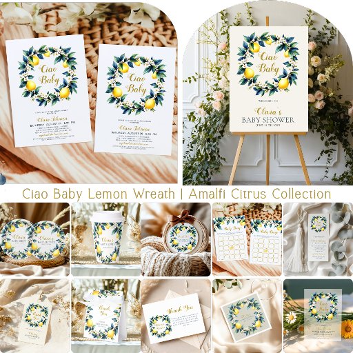 Elevate your baby shower with sophisticated Italian luxury using this Clear Acrylic "Ciao Baby" Lemon Wreath Invitation! A breathtaking watercolor wreath of vibrant yellow lemons, soft green/blue leaves, dainty white blossoms, and elegant gold script glows through crystal-clear acrylic — perfectly evoking the sunny Amalfi Coast groves, Positano terraces, and Mediterranean paradise vibes.