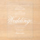 A beautiful clear acrylic transparent wedding invitation with traditional script typography. A stunning white and clear wedding invite design with minimalistic classy typography. Traditional script typography creates a timeless elegant clear acrylic wedding invitation design.