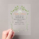 A modern clear acrylic wedding invitation featuring a soft greenery frame and a baby's breath bouquet centerpiece. perfect for outdoor garden weddings, this minimalist style highlights the beauty of transparent acrylic for a chic, timeless look.