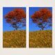 A peaceful 3D landscape in fall, created in Vue. On top of a hill covered with tall golden grass, against a clear blue sky, a solitary orange maple stands with a wooden bench under it to stop and rest on.