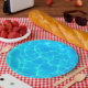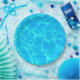 Paper plates with a photograph of clear blue pool water, with shimmering reflections.