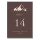 This clear mountain country wedding table number is perfect for a rustic wedding. The design features an idyllic watercolor beige mountain.