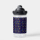 Clear plastic sippy cup with a dark blue sleeve featuring colorful confetti-like patterns. The cup has a black lid and spout. Displayed front and back.