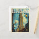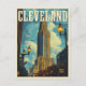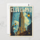 Discover the iconic landmarks in Cleveland, Ohio, beautifully illustrated in a vintage travel postcard style. This vector artwork features a muted colour palette, bold typography, and classic design elements like street lamps and clouds.