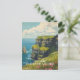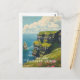 A scenic postcard showcasing the dramatic Cliffs of Moher in Ireland, with sheer rock faces rising above the Atlantic Ocean under a soft, cloudy sky.