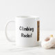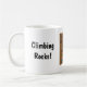 Eye-catching image of climbers equipment on a board outside mountaineering gear shop. Red helmet and black ice axe among a colourful display of carabiners. With 'Climbing Rocks!' slogan, or choose 'customise' to add your own.